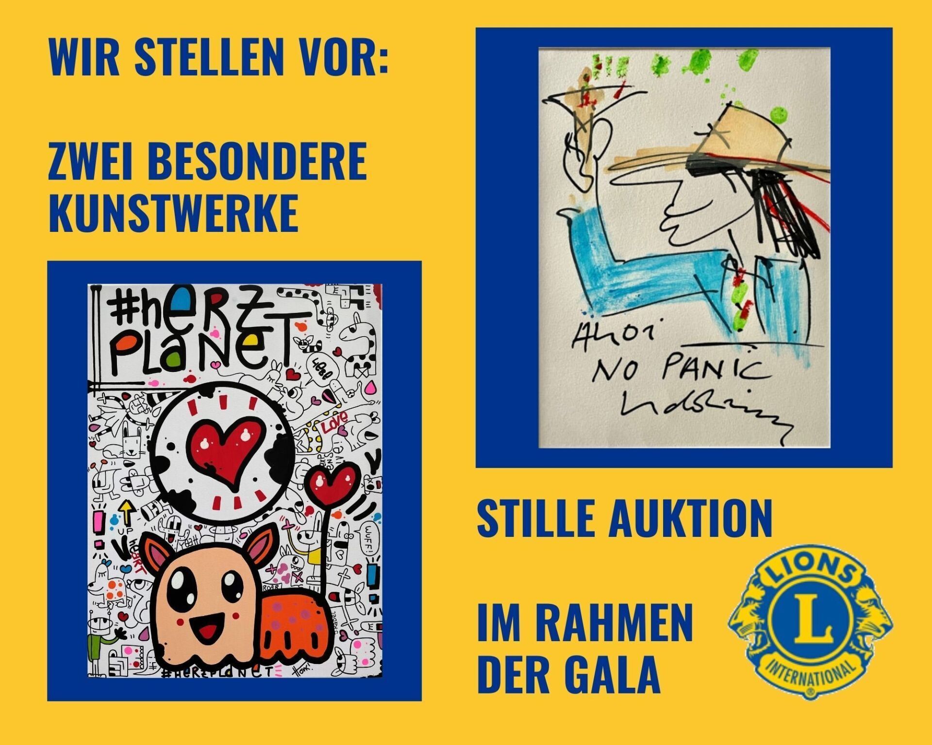 Im Rahmen unserer Benefiz-Gala zum 25. Jubiläum am 15. Oktober 2022 wurden zwei exklusive Kunstwerke bei einer Stillen Auktion versteigert. Die Kunstwerke wurden von unserem Sponsor Walentowski Galerien zur Verfügung gestellt. Der Erlös der Auktion kommt unserem Jahresprojekt zugute. Es handelt sich um die Werke Ahoi No Panik von Udo Lindenberg sowie HERZPLANET von Jürgen Kadel. Beide Kunstwerke fanden im Rahmen der Stillen Auktion 2022 glückliche neue Besitzer.